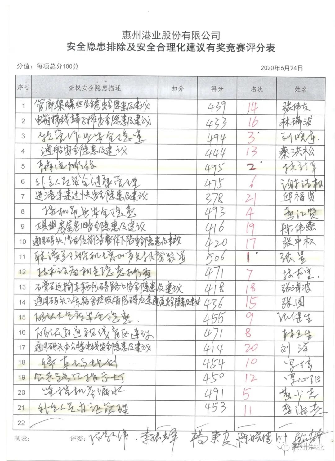 6月1-23日,隐患查找及安全合理化建议:21人参赛,产生一等奖2个,二等奖3个,三等奖4个,收集的安全隐患及合理化建议,已汇总整理分发至各相关部门核查、整改落实。