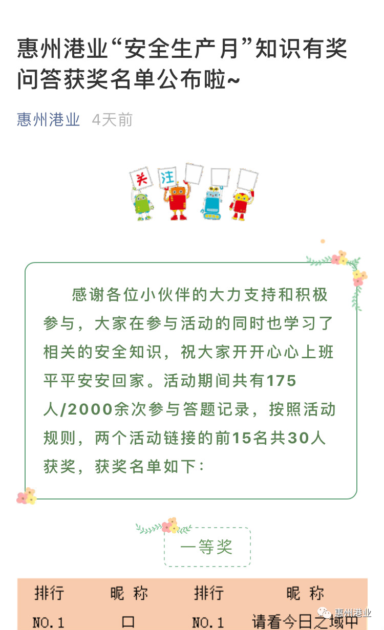 6月8-19日,《惠州港业》公众号安全知识有奖问答,参与人数175人2000余次答题,30人获奖。